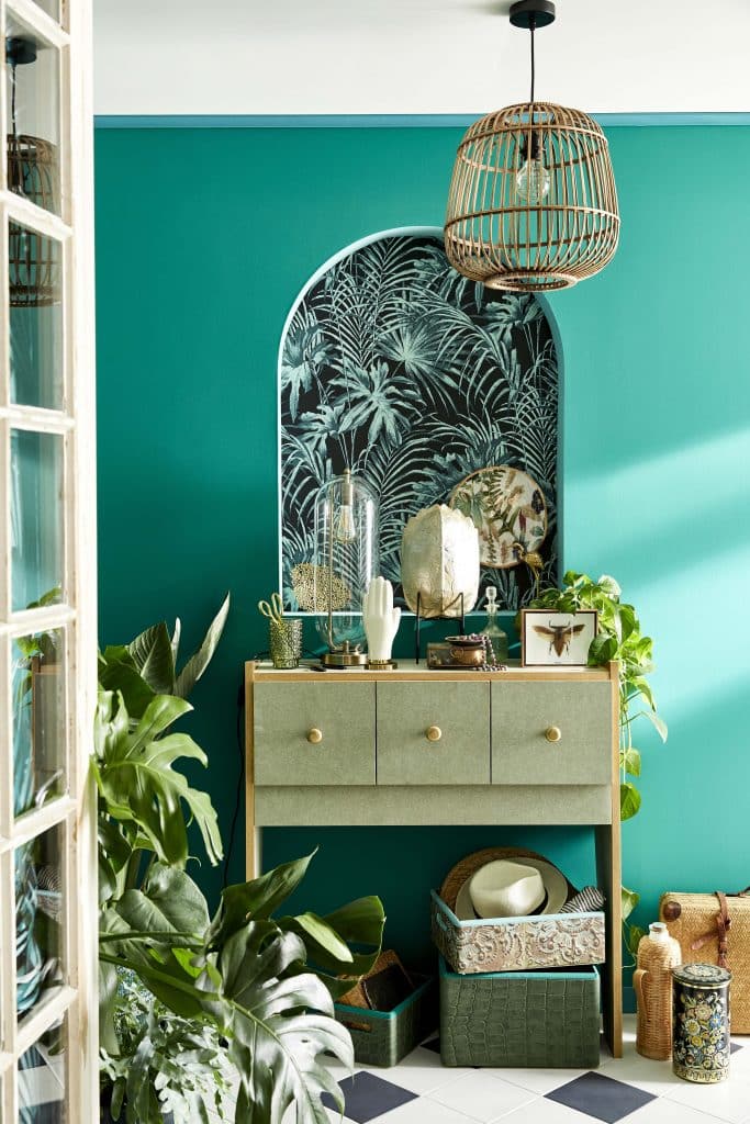 Une entrée marquante ? Rien de tel qu’un mur vert d’eau associé à une niche tapissée d’un motif jungle : la recette parfaite pour un accueil qui a du panache. Dans un salon, souligner la cheminée, un poêle ou un meuble d’exception par une teinte bien choisie les remet instantanément au centre de la pièce, sans effort technique ni budget disproportionné.