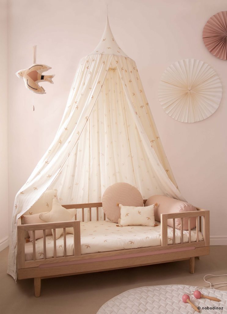 Dans une chambre d’enfant, les roses poudrés remportent la mise, comme le montre cette ambiance signée NOBODINOZ.