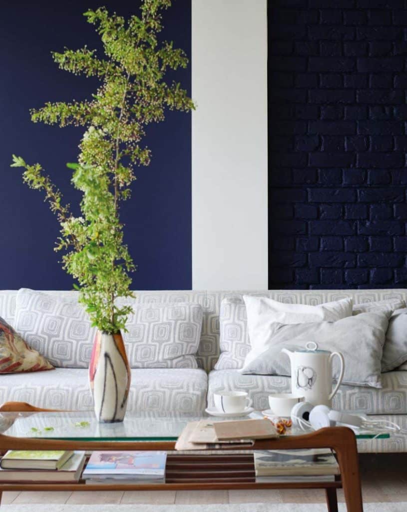 La couleur idéale dépend aussi des teintes déjà présentes dans la décoration. Sur une base neutre (blanc, beige, gris), une couleur profonde comme le bleu nuit ou le prune donne du caractère. Un exemple concret : dans un salon dominé par ces teintes neutres, un pan de mur bleu profond souligne une cheminée de briques et rompt la monotonie.